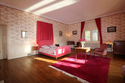 A very large library room decorated with a sumptuous chimney, large libraries and king size bed with sight on the main courtyard and the Dordogne valley. Contiguous bathroom and toilets. |