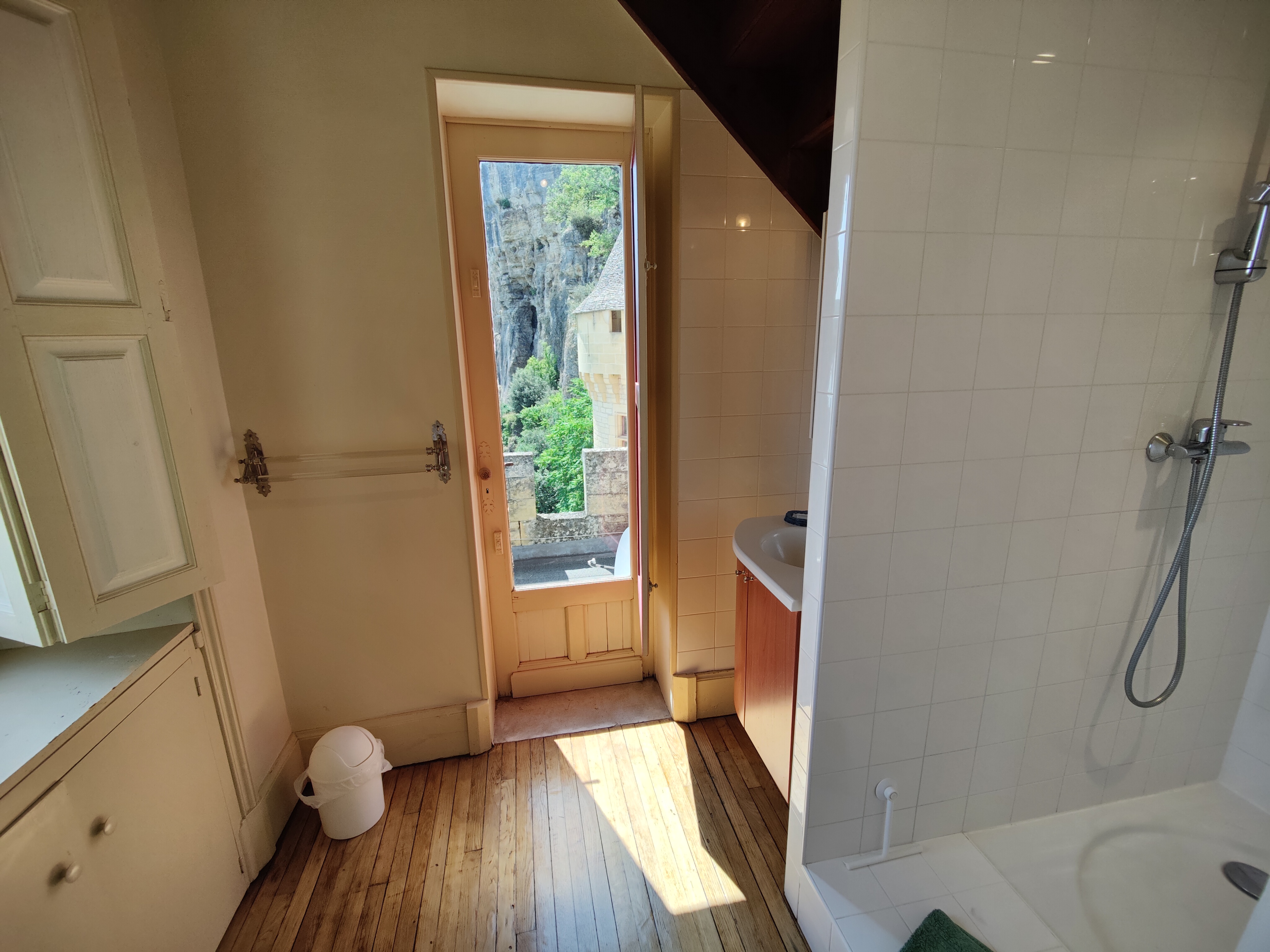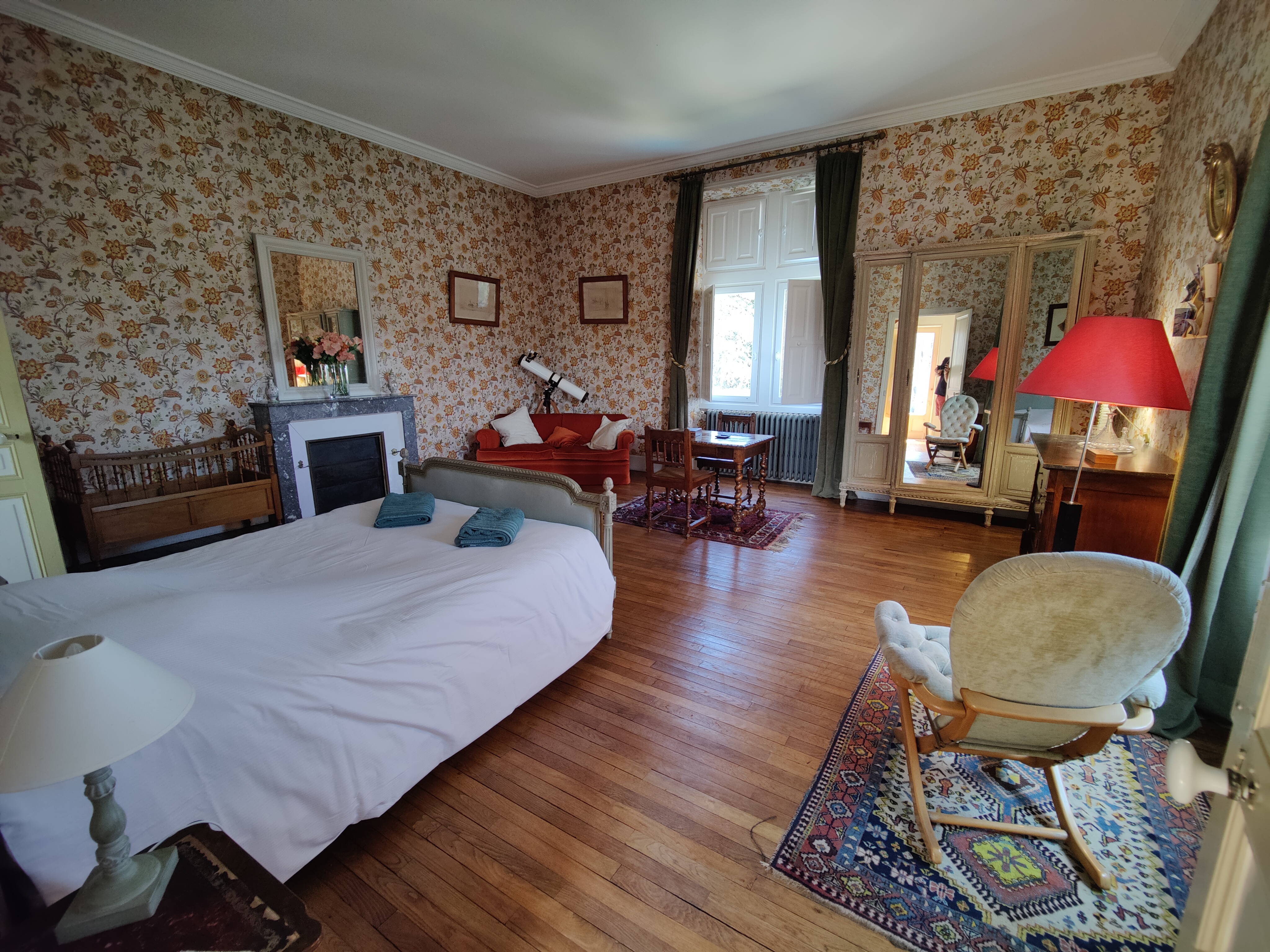 Grande chambre avec un grand lit. Salle de bain et toilettes attenantes. Vue majestueuse sur la vallée de la Dordogne.